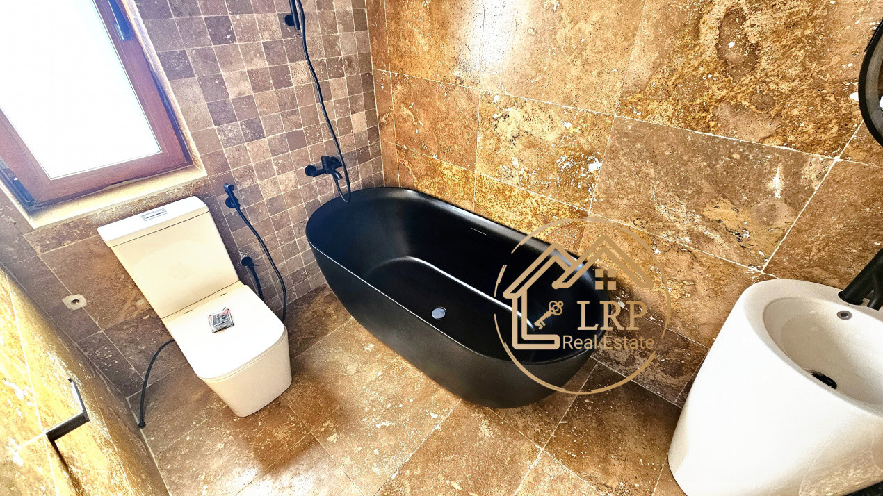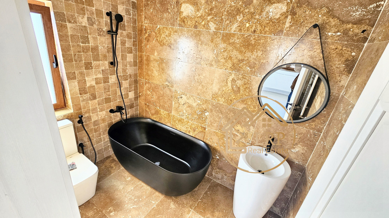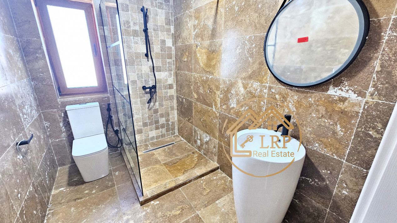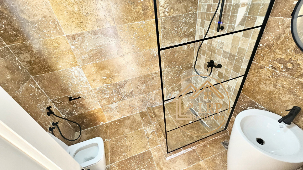 - pardoseli: parchet 10 mm (calitate superioară); travertin în bucătărie, băi și holuri;