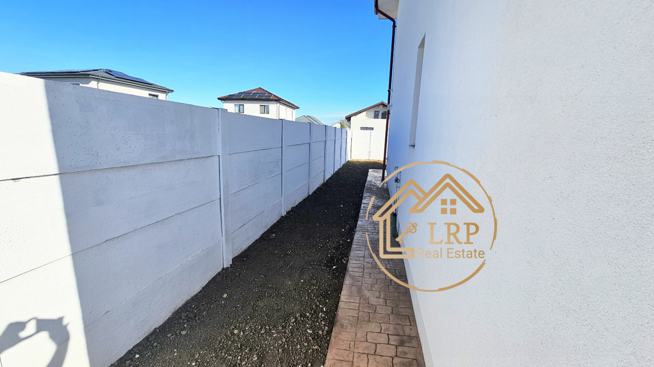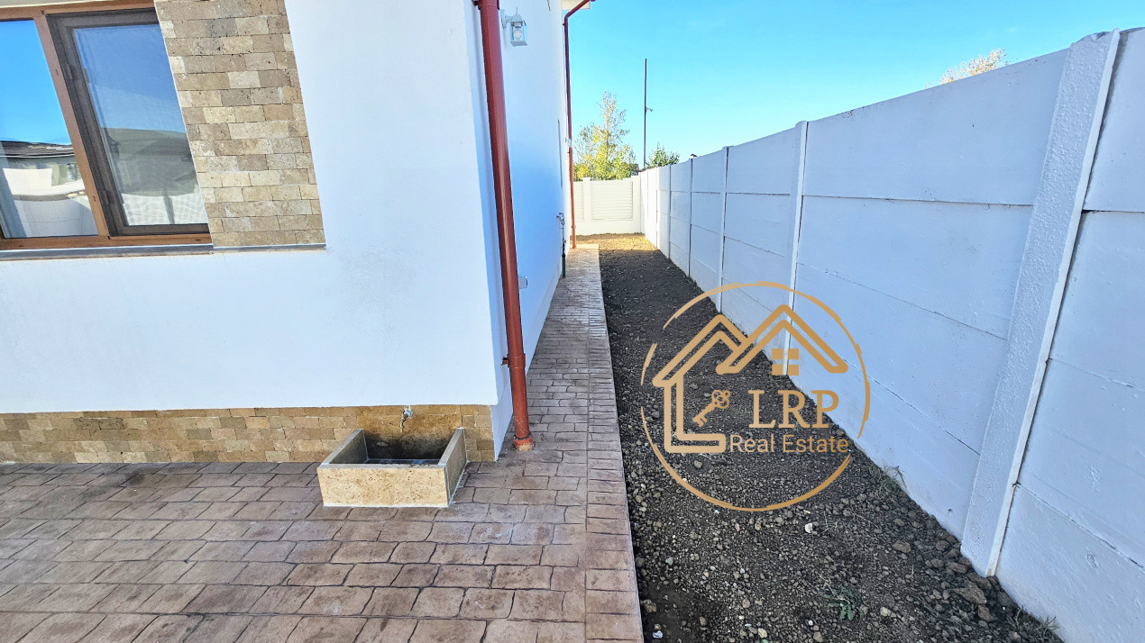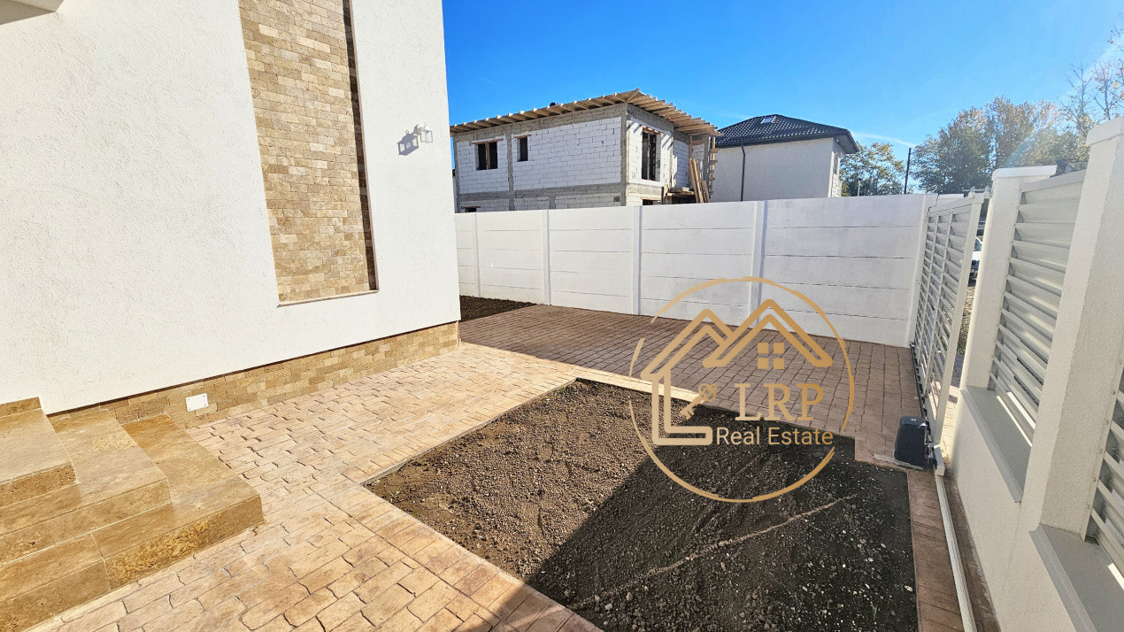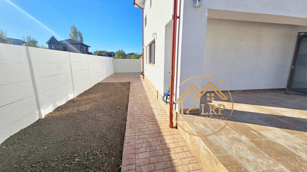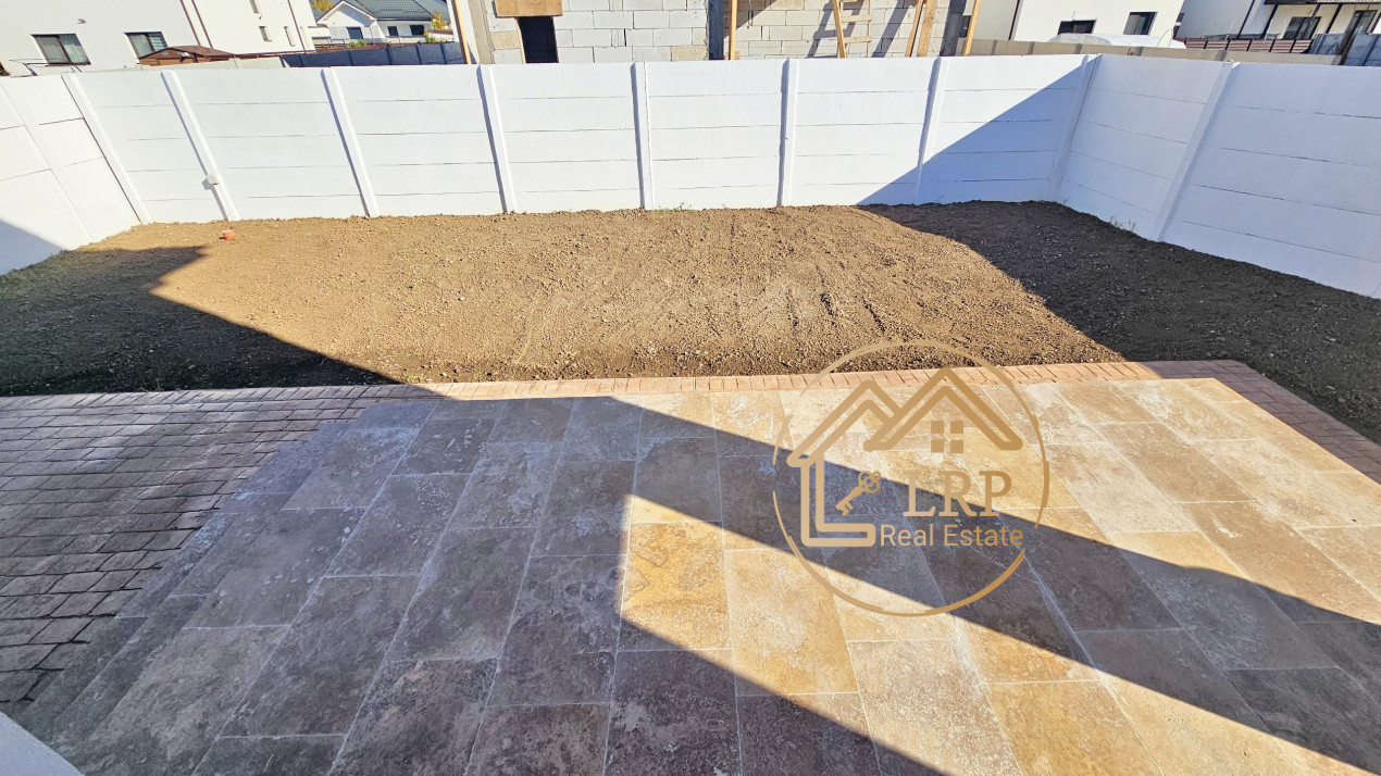 Vila este poziționată în fața terenului (zonă parcare și grădină frontală), iar în spate se prelungește cu o grădină generoasă de cca 100 mp și o terasă spațioasă accesibilă din bucătărie.
